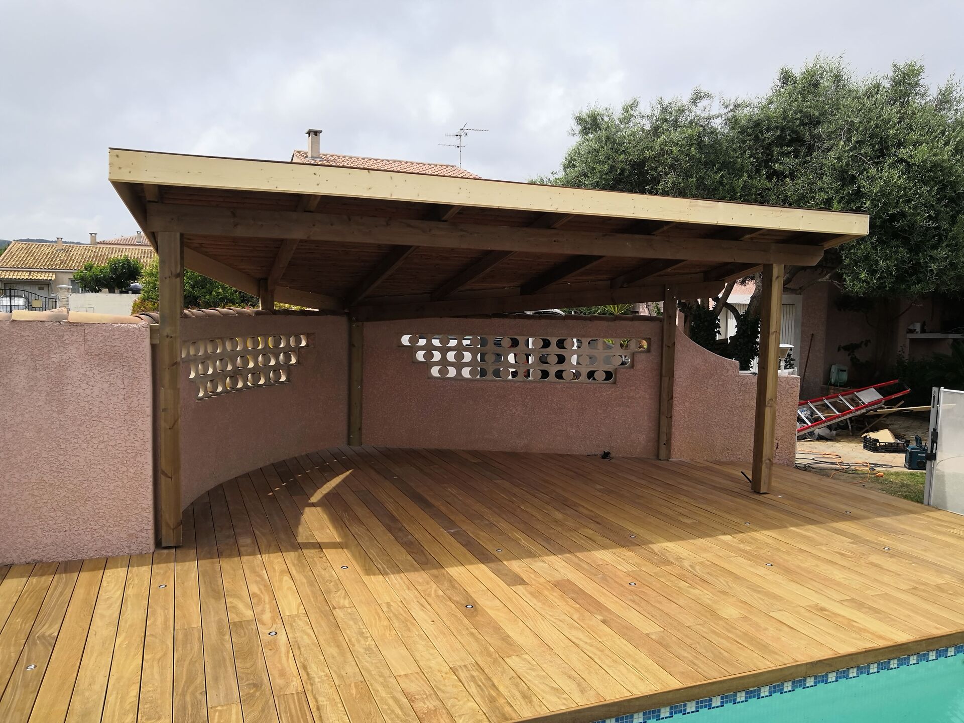 Abri cuisine été en ossature bois avec terrasse en exotique autour du piscine Sète à côté de Frontignan