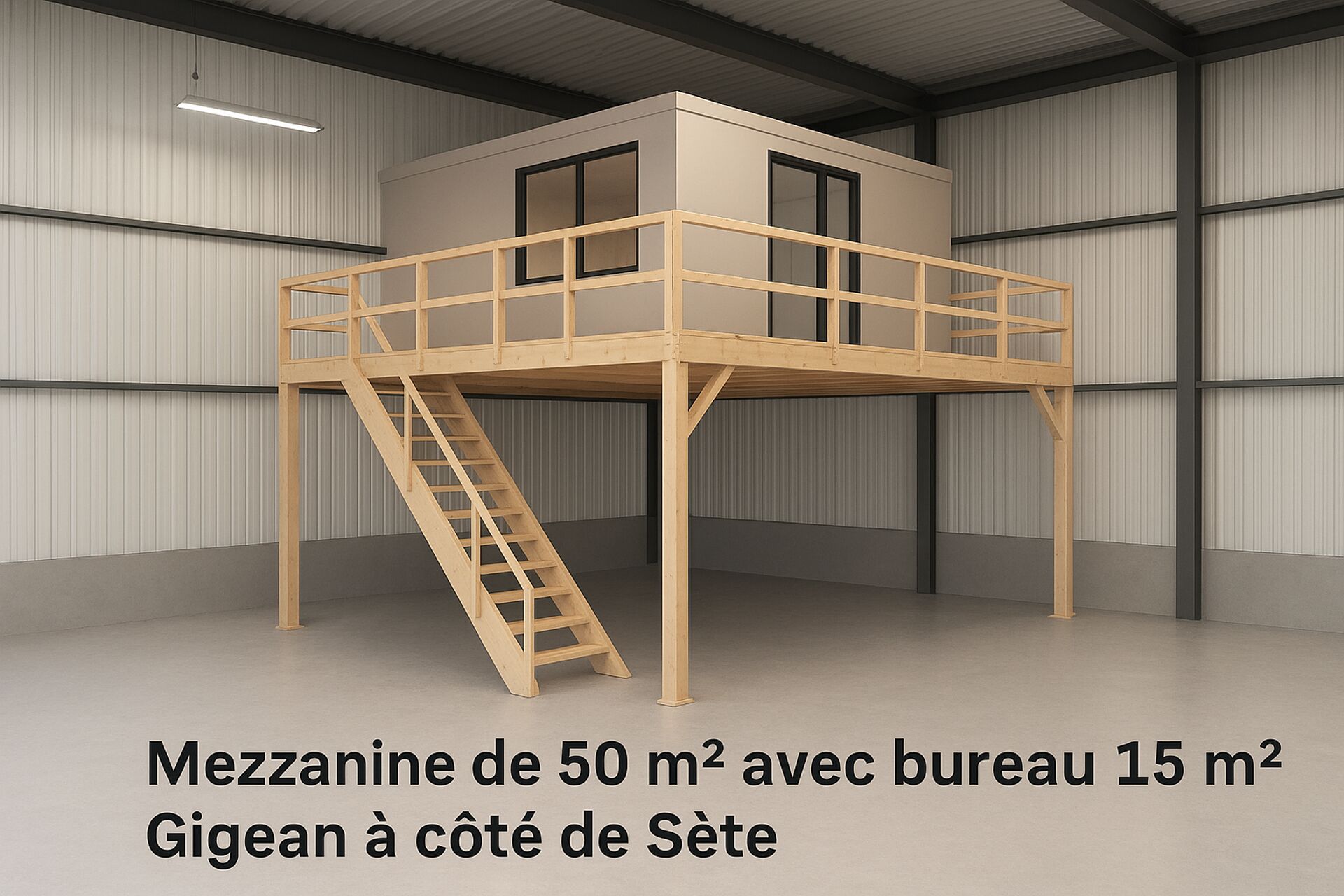 Réalisation d’une mezzanine bois sur mesure de 50 m² dans un entrepôt artisanal, intégrant un bureau fonctionnel de 15 m² en partie haute. Cette mezzanine avec escalier bois optimise la hauteur sous plafond tout en créant un espace de travail confortable et lumineux. Conception robuste, adaptée à un usage professionnel, idéale pour artisans et PME. Projet pensé pour allier solidité, esthétisme et fonctionnalité.